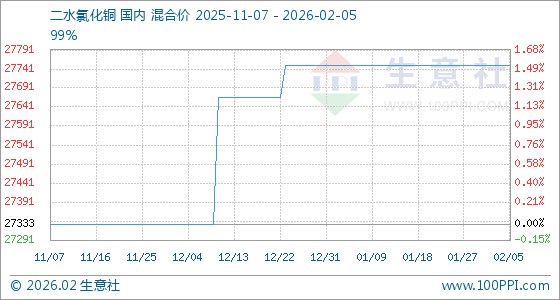 2月5日,生意社二水氯化铜基准价为27750.00元/吨,与本月初持平。