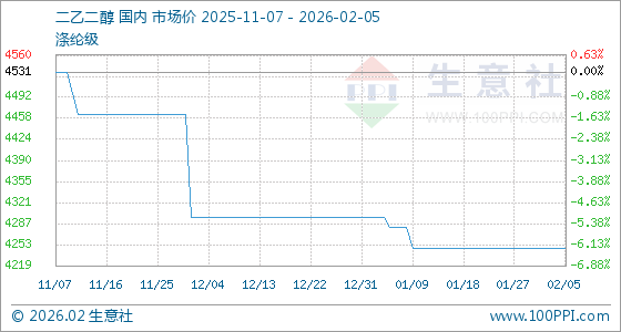 2月5日,生意社二乙二醇基准价为4248.33吨,与本月初持平。