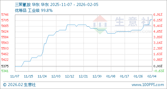 2月5日,生意社三聚氰胺基准价为5712.50元/吨,与本月初(5675.00元/吨)相比,上涨了0.66%。