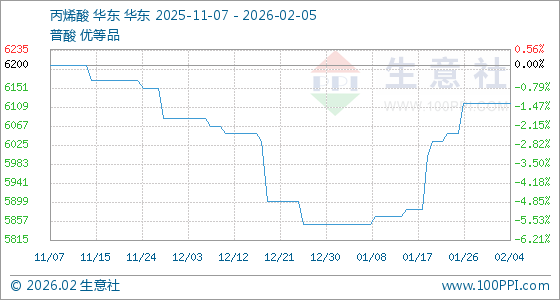 2月5日,生意社丙烯酸基准价为6116.67元/吨,与本月初持平。