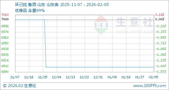 2月5日,生意社环己烷基准价为6900.00元/吨,与本月初持平。
