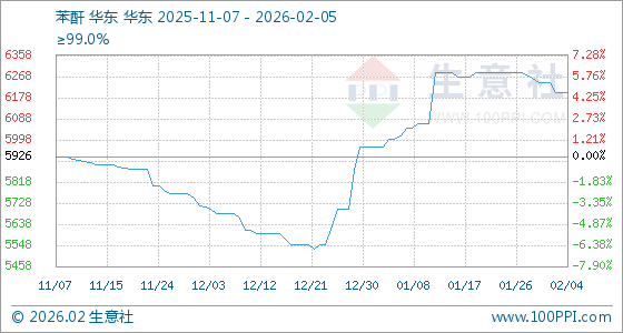 2月5日,生意社苯酐基准价为6200.00元/吨,与本月初(6243.33元/吨)相比,下降了0.69%。