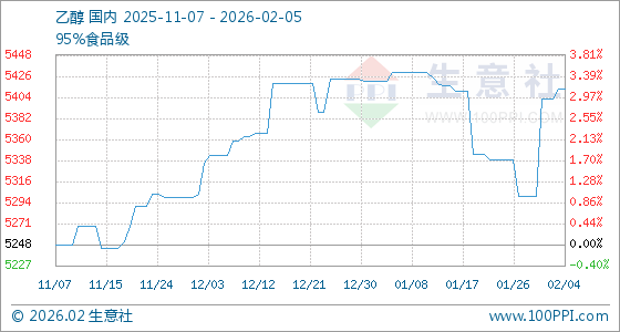 2月5日,生意社乙醇基准价为5413.33元/吨,与本月初(5403.33元/吨)相比,上涨了0.19%。