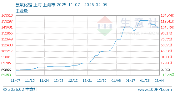 2月5日,生意社氢氧化锂(工业级)基准价为143000.00元/吨,与本月初(148000.00元/吨)相比,下降了3.38%。