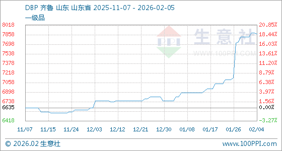 2月5日,生意社DBP基准价为7868.33元/吨,与本月初(7818.33元/吨)相比,上涨了0.64%。