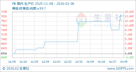 2月6日,生意社PX基准价为7650.00元/吨,与本月初(7300.00元/吨)相比,上涨了4.79%。