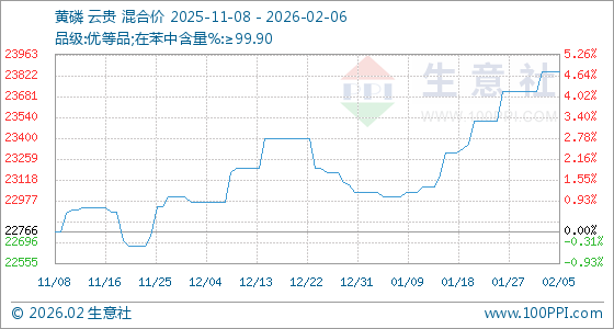 2月6日,生意社黄磷基准价为23846.00元/吨,与本月初(23712.67元/吨)相比,上涨了0.56%。