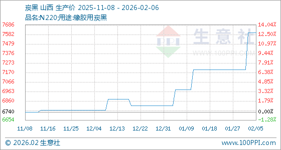 2月6日,生意社炭黑基准价为7600.00元/吨,与本月初(7200.00元/吨)相比,上涨了5.56%。