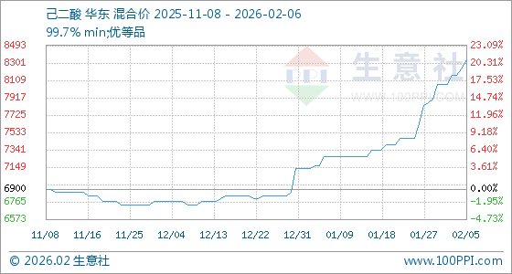 2月6日,生意社己二酸基准价为8333.33元/吨,与本月初(8066.67元/吨)相比,上涨了3.31%。