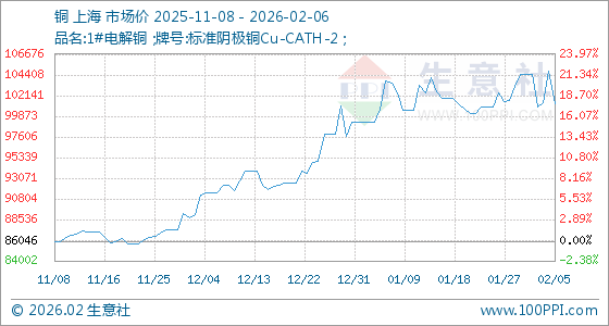 2月6日,生意社铜基准价为101288.33元/吨,与本月初(104496.67元/吨)相比,下降了3.07%。