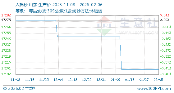 2月6日,生意社人棉纱基准价为17200.00元/吨,与本月初持平。