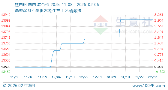 2月6日,生意社钛白粉基准价为13900.00元/吨,与本月初持平。