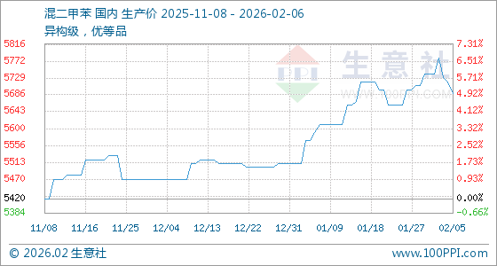 2月6日,生意社混二甲苯基准价为5690.00元/吨,与本月初(5740.00元/吨)相比,下降了0.87%。