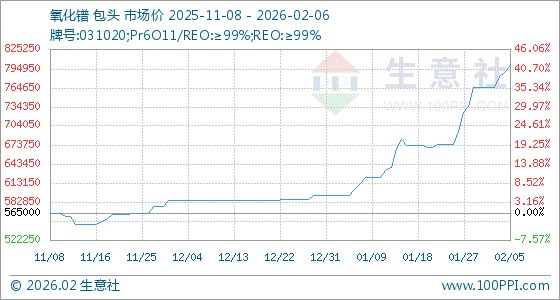 2月6日,生意社氧化镨基准价为800000.00元/吨,与本月初(765000.00元/吨)相比,上涨了4.58%。