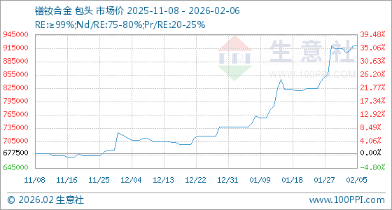 2月6日,生意社镨钕合金基准价为920000.00元/吨,与本月初(915000.00元/吨)相比,上涨了0.55%。