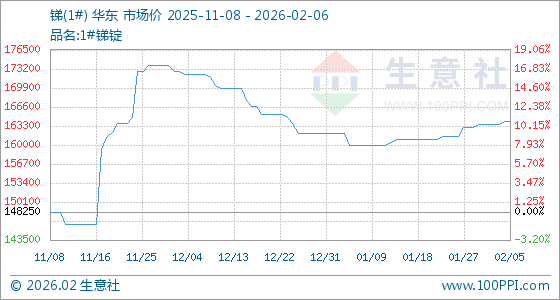 2月6日,生意社锑(1#)基准价为164000.00元/吨,与本月初(163500.00元/吨)相比,上涨了0.31%。