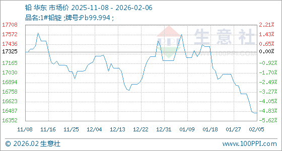 2月6日,生意社铅基准价为16465.00元/吨,与本月初(16735.00元/吨)相比,下降了1.61%。