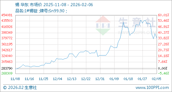 2月6日,生意社锡基准价为381200.00元/吨,与本月初(427370.00元/吨)相比,下降了10.8%。