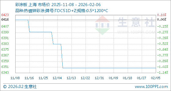 2月6日,生意社彩涂板基准价为6350.00元/吨,与本月初持平。