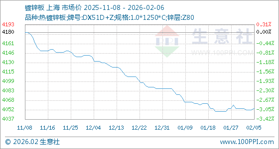2月6日,生意社镀锌板基准价为4055.00元/吨,与本月初持平。
