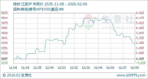 2月6日,生意社线材基准价为3370.00元/吨,与本月初(3410.00元/吨)相比,下降了1.17%。