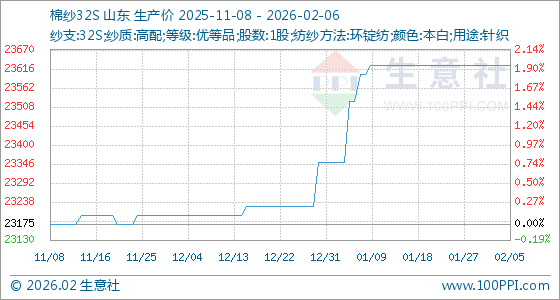 2月6日,生意社棉纱32S基准价为23625.00元/吨,与本月初持平。