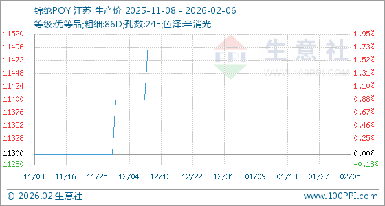 2月6日,生意社锦纶POY基准价为11500.00元/吨,与本月初持平。