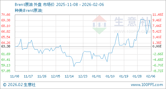 2月6日,生意社Brent原油基准价为69.46美元/桶,与本月初(69.59美元/桶)相比,下降了0.19%。