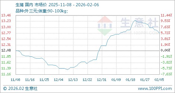 2月6日,生意社生猪基准价为12.77元/公斤,与本月初(12.98元/公斤)相比,下降了1.62%。