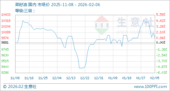 2月6日,生意社菜籽油基准价为9980.00元/吨,与本月初(10298.00元/吨)相比,下降了3.09%。