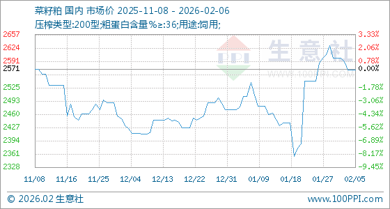 2月6日,生意社菜籽粕基准价为2570.00元/吨,与本月初(2600.00元/吨)相比,下降了1.15%。