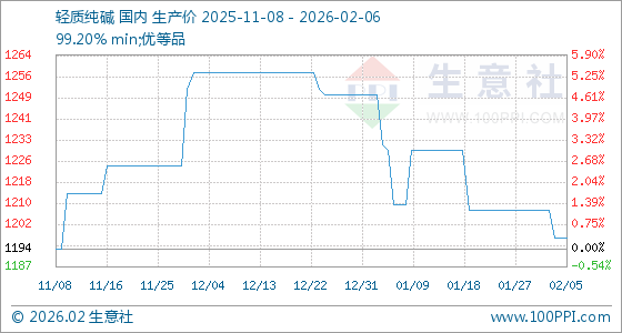 2月6日,生意社轻质纯碱基准价为1198.00元/吨,与本月初(1208.00元/吨)相比,下降了0.83%。