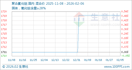 2月6日,生意社聚合氯化铝基准价为1720.00元/吨,与本月初持平。