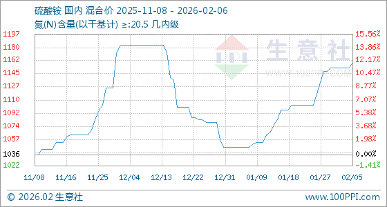 2月6日,生意社硫酸铵基准价为1160.00元/吨,与本月初(1153.33元/吨)相比,上涨了0.58%。