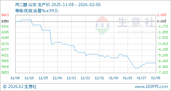 2月6日,生意社丙二醇基准价为5950.00元/吨,与本月初持平。