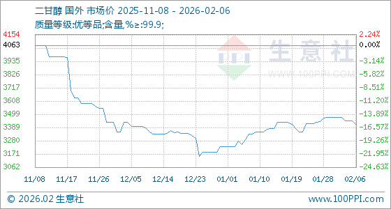 2月6日,生意社二甘醇基准价为3446.67元/吨,与本月初(3475.00元/吨)相比,下降了0.82%。