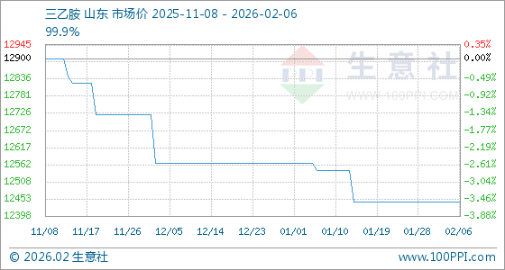 2月6日,生意社三乙胺基准价为12444.44元/吨,与本月初持平。