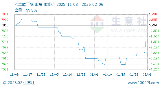 2月6日,生意社乙二醇丁醚基准价为7757.14元/吨,与本月初(7657.14元/吨)相比,上涨了1.31%。