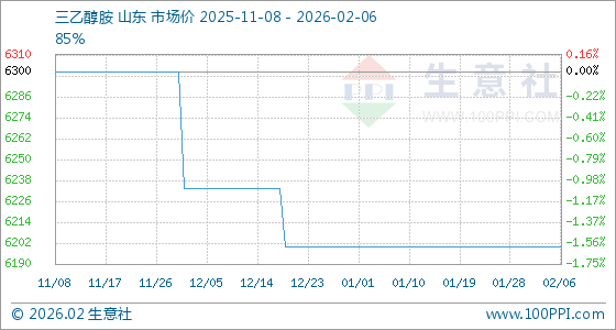 2月6日,生意社三乙醇胺基准价为6200.00元/吨,与本月初持平。