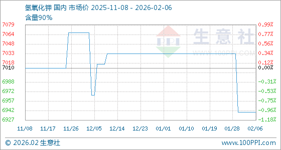 2月6日,生意社氢氧化钾基准价为6940.00元/吨,与本月初持平。