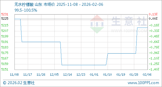 2月6日,生意社无水柠檬酸基准价为5212.50元/吨,与本月初持平。
