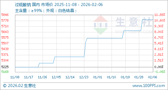 2月6日,生意社过硫酸钠基准价为5790.00元/吨,与本月初持平。
