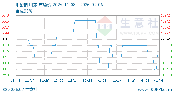 2月6日,生意社甲酸钠基准价为2620.00元/吨,与本月初持平。