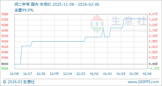 2月6日,生意社间二甲苯基准价为9333.33元/吨,与本月初持平。
