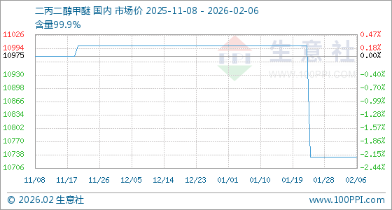 2月6日,生意社二丙二醇甲醚基准价为10733.33元/吨,与本月初持平。