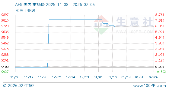 2月6日,生意社AES基准价为9700.00元/吨,与本月初持平。