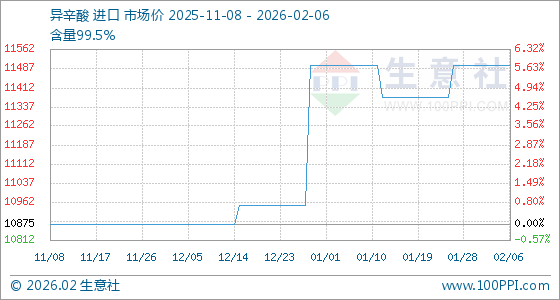 2月6日,生意社异辛酸基准价为11500.00元/吨,与本月初持平。