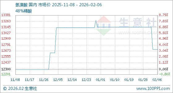 2月6日,生意社氢溴酸基准价为12700.00元/吨,与本月初(13150.00元/吨)相比,下降了3.42%。