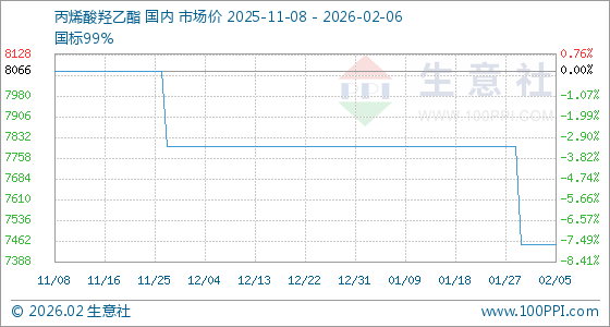 2月6日,生意社丙烯酸羟乙酯基准价为7450.00元/吨,与本月初持平。