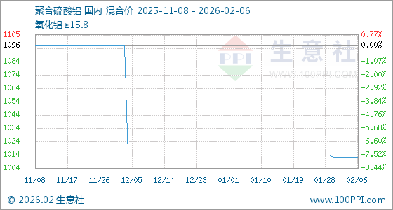 2月6日,生意社聚合硫酸铝基准价为1012.50元/吨,与本月初持平。